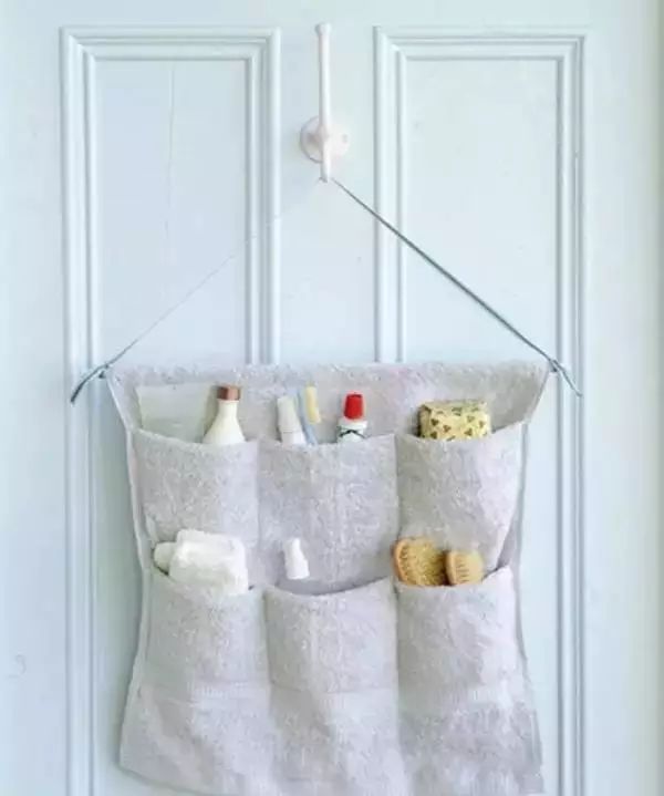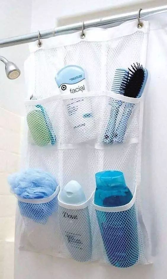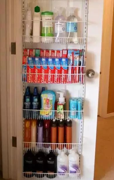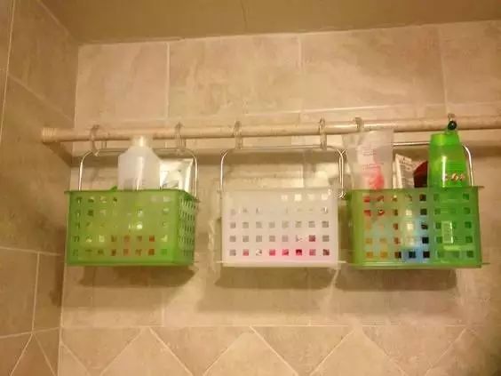 可以在浴室空白的墙面横起一根杆子,然后挂上万能的收纳篮或者收纳袋。
