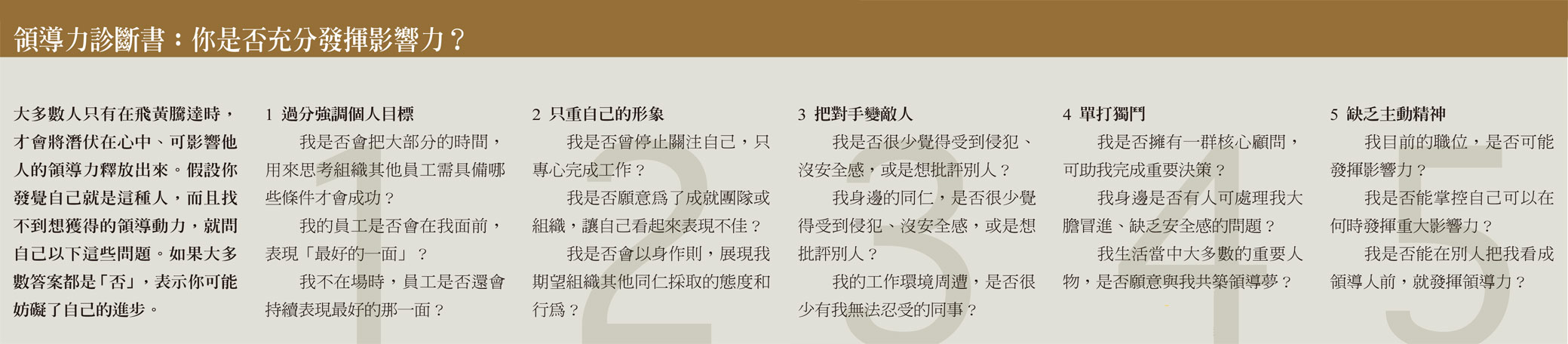 不過,太沈得住氣,可能對前途看好的領導人不利。耐心會逐步削弱我們的領導潛力,說服我們保持低調,努力不懈,等著別人發現我們努力的成果,然後好好犒賞我們,送給我們更大的頭銜,以及正式的職權。這種態度會遇到的問題是,一個健全的組織,只會獎勵主動領導的人。雖然權力總是伴隨著影響力,但兩者的關係,往往和我們想像中不一樣。比較常見的狀況是,先發揮影響力,才能獲得權勢,而非先有權力,才有影響力。我們研究的大多數傑出領導人,都不會等到取得正式許可後,才進行改變。雖然,他們最後都爬上了高位,但在此之前,他們就已展現領導力。他們藉由各種方式來運用手中非正式的權力。
