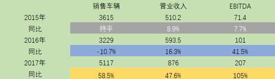 在帕尔默的卓越领导下,阿斯顿马丁开始回复生机。如下表显示:2015-2017,阿斯顿马丁的收入同比增长是:8.9%,16%和48%;EBITDA同比增长是:7.7%, 41.5%和惊人的105%,三年复合增长约为46%。