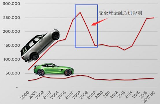 从上图可以看出:1),相比豪华跑车,豪华SUV的市场规模大得多,并且从销售总量上已经完爆豪华跑车;2),相比豪华跑车市场近年来接近饱和的状态,豪华SUV市场依然保持着强劲的增长趋势。