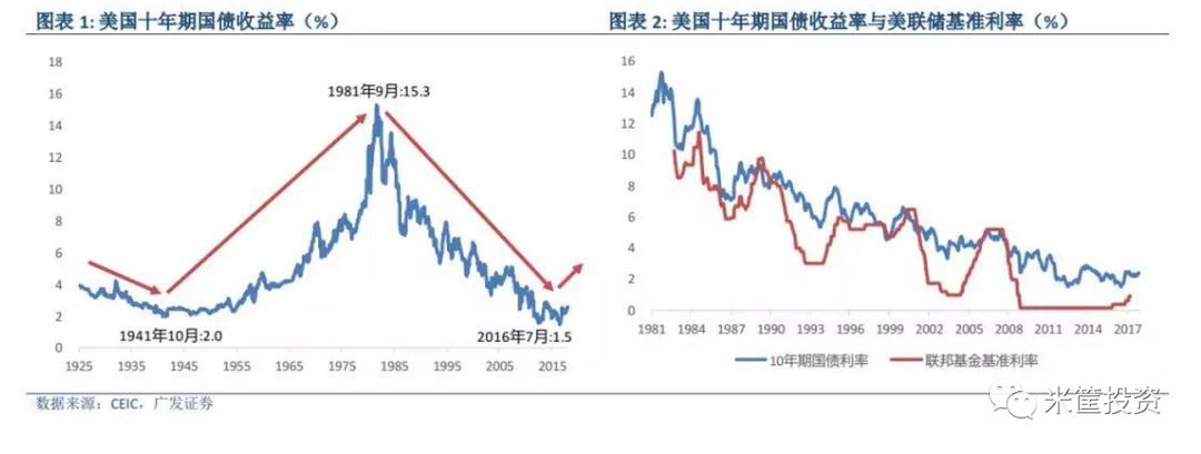 我们看到从1981年创历史高点15.3%之后,2016年7月出现了历史低点1.5,目前已经回升到2.8左右,从周期的低谷到波峰,再从波峰到低谷,各约 40 年(±5 年),合成 80 年左右一个长周期。也就是说,这次利率的上涨周期可能要展望到2046年!