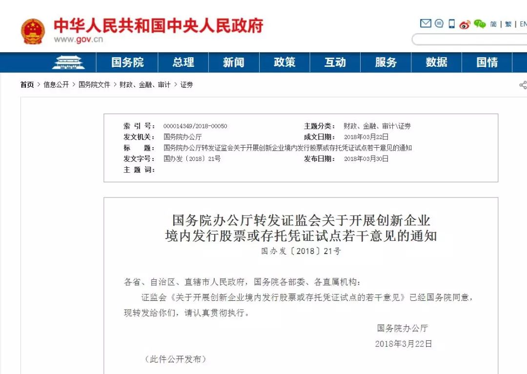 近日,“中国政府网”发布了“国务院办公厅转发证监会关于开展创新企业境内发行股票或存托凭证试点若干意见的通知”。