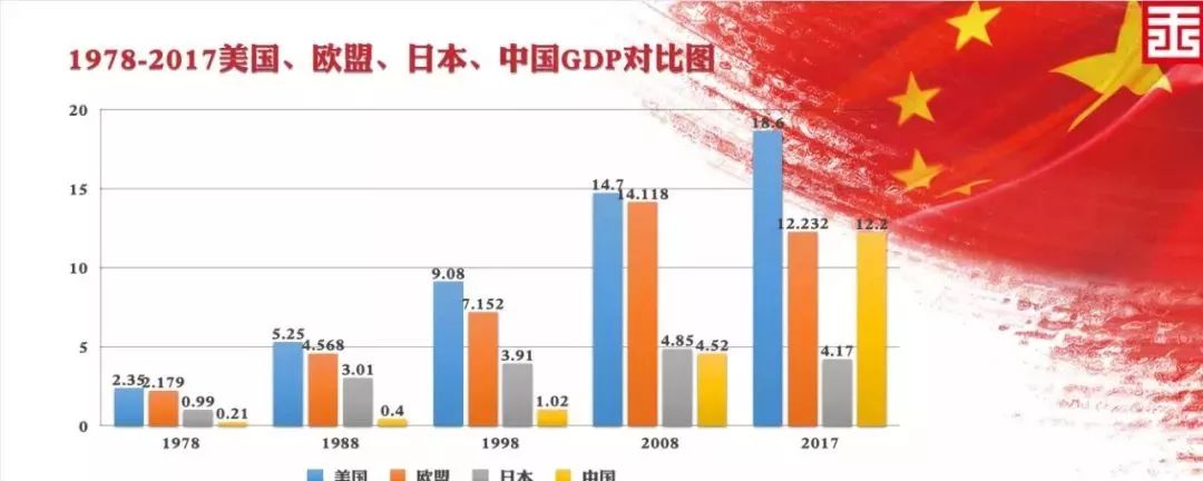 大家可以看看图片上的这些数据。1978年这四个经济体的比较,美国2.35万亿美金,欧盟就是2.17万亿,日本0.99万亿,中国0.2亿,连别人的零头都赶不上。如今2017年,美国18.6万亿,欧盟12.2万亿,日本4.1万亿,中国12.2万亿。我们从原来的微不足道,到今天和欧洲所有的发达国家加起来是一样的,目前是日本的三倍,而且接近了美国,这就是这40年中国的天翻地覆之变,这就是每个人获得感和幸福感的来源(全场鼓掌)。