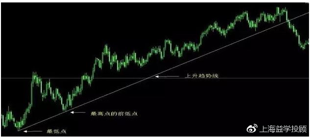 连接某一时间段内的最低点或相对低点与最高点之前的某一低点,且不能中间穿越任何价位的直线,叫上升趋势线。