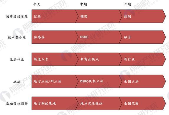 生态体系从各种互联网公司新进入到逐渐产生新的商业模式,最终发展成新的行业。立法方面,从地方立法/州立法,到DSRC 强制立法,到全国范围的立法。