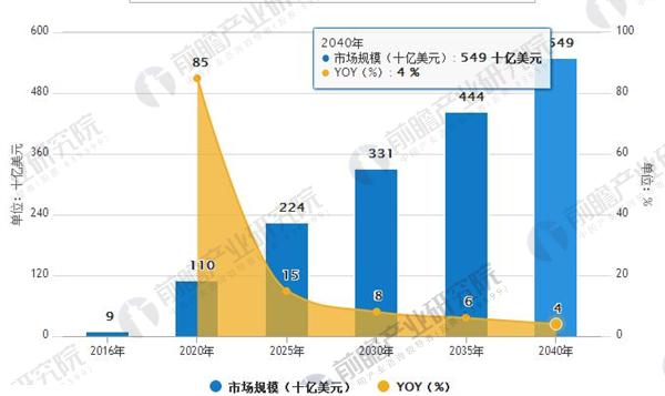根据前瞻产业研究院发布的《中国无人驾驶汽车行业发展前景预测与投资战略规划分析报告》相关数据,无人驾驶汽车到2025年可以催生出一个2000亿至1.9万亿美元的巨大市场。至2035年全球无人驾驶汽车销量将达到1180万辆,2025-2035年间年复合增长率为48.35%,届时中国将占据全球市场24%的份额。