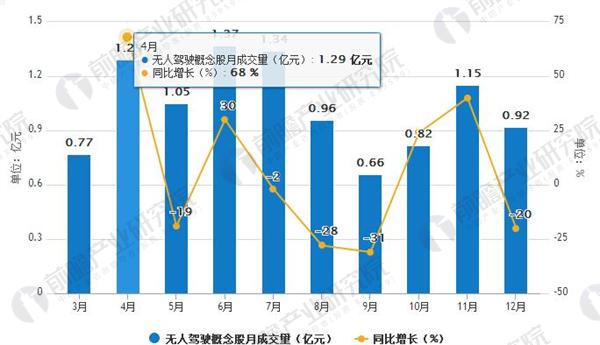 截止到2016年12月底,无人驾驶概念股共41只,2016年1-12月无人驾驶概念股累计成交量为10.33亿元。
