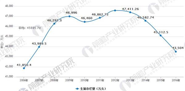 据前瞻产业研究院发布的《中国生猪养殖行业市场前瞻与投资预测分析报告》数据显示,2014-2016年全年我国生猪存栏分别为46582.74、45112.5和43504万头,2015年与2014年相比存栏下降为11.19%,2016年与2015年相比下降3.85%。