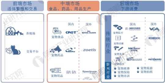 宠物产业链可分为前端活体繁殖和交易环节,中端的宠物食品、用品、药品生产环节以及后端的下游消费环节。近年来随着情感需求的进一步升级,加之资本的进一步追捧,在下游消费环节除了传统的宠物医疗、宠物诊断服务、宠物美容、宠物超市服务外,诸如宠物殡葬、宠物训练、宠物拍照等新兴服务也逐步兴起。