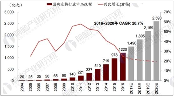 据前瞻产业研究院发布的《宠物用品及服务行业市场调研与投资预测分析报告》数据显示,截止到2016年底,宠物数量已达0.87亿只,宠物市场消费约1220亿元,城镇平均养宠率约为11%。目前中国宠物市场规模世界排名第三,成为世界宠物市场的重要一部分。2017年中国宠物行业市场规模达到1800亿元,2018年有望突破2000亿元。