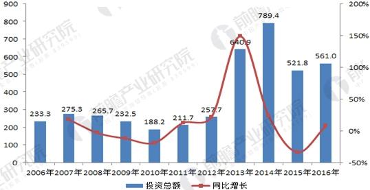 2006-2016年中国大气污染治理投资情况(单位:亿元,%)