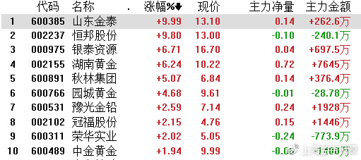 地缘政治局势再度恶化,美方航母打击战斗群奔赴中东,受此影响避险情绪推升,盘中黄金股再次受到资金追捧,多只个股大涨,延续昨日强势行情。