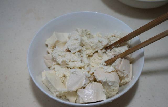 1.鸡蛋中加入适量盐,用筷子将鸡蛋打散,再用筷子将豆腐块打成散块。