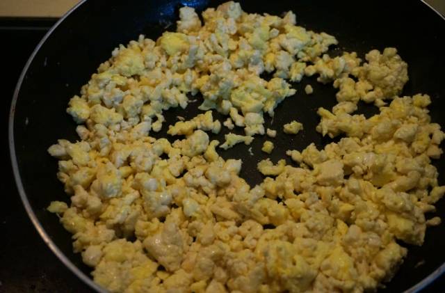 4、用铲子翻炒均匀,成块,出锅。