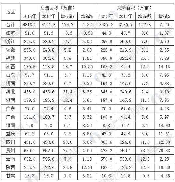 2016年全国18个产茶省(区)茶园面积比上年增加近100万亩,总面积接近4400万亩,增幅控制在2.6%以内,比上年低近2个百分点。其中,湖北、陕西、四川3省茶园面积增加较多,均超过15万亩。开采茶园面积3637万亩,增加250万亩。2015年全国18个产茶省茶园面积共计4316万亩,同比增长175万亩,增长率4.2%;采摘面积3387万亩,同比增加228万亩,增长7.22%。茶园面积与采摘面积均较之去年增长速度放慢。部分省份如湖北、贵州、陕西、四川省大力发展茶产业,茶园面积增加明显,分别达到466万亩,689.1万亩,215.9万亩,481.6万亩。