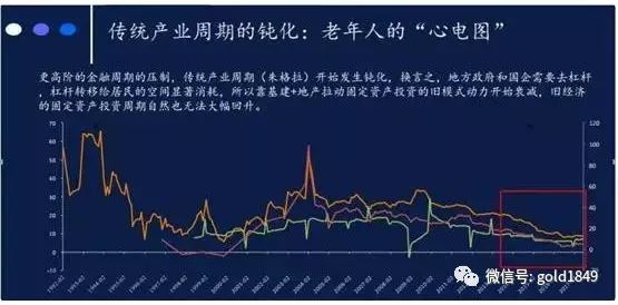 上图红色的线,代表电子产品、计算机、通讯产品,这些产业,有15%的增长速度。这是一颗青年小伙子的心脏。但是蓝色的线,代表重化工、矿业,这些是负增长。把新旧产业结合在一起,就是增长6%的老年轻的心电图。