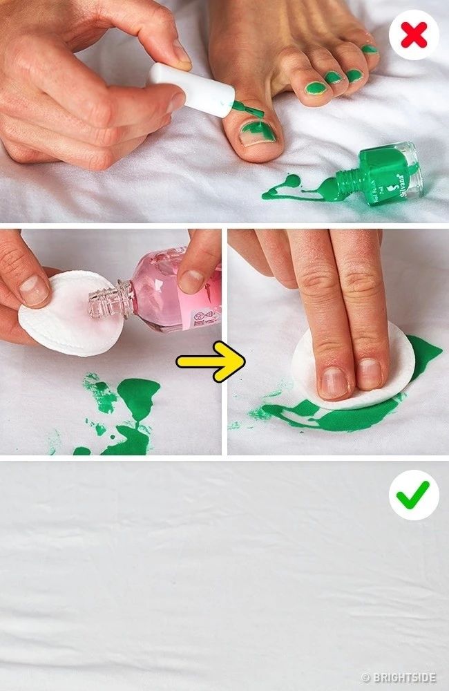 指甲油迹粘到衣物上不好去除,特别是干了以后还会变硬,颜色会渗透进布料中。这个时候你需要一块酒精棉,从污渍的反面擦拭,直到污渍从正面淡去即可,最好用热水清洗哦!