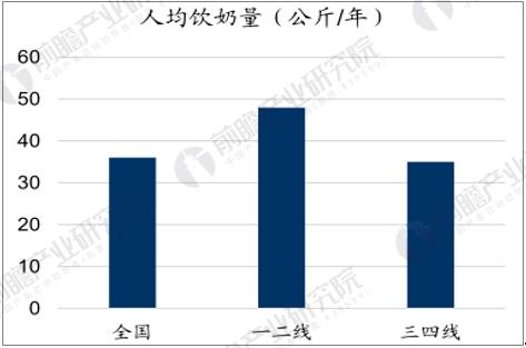 根据前瞻产业研究院发布的《乳制品行业市场需求预测与投资战略规划分析报告》统计数据显示,2016年中国人均饮奶量为36公斤/年,其中一二线城市的人均饮奶量为48公斤/年,但是三四线城市的人均饮奶量仅有15公斤/年,明显低于全国平均水平,具有较大的上升空间。