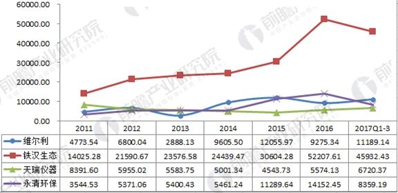 2011-2017年我国土壤修复主要上市企业净利润比较(单位:万元)