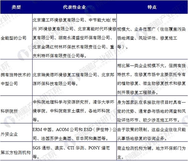 基于国家政策大力扶持,土壤修复行业逐渐兴起。据前瞻产业研究院发布的《土壤修复行业市场前瞻与投资战略规划分析报告》数据显示,2013年9月,国内从事土壤修复的企业数量达到300多家,2014年土壤修复市场约有500家企业,到2016年增长至1000家以上。按照公司规模和企业性质综合进行分类,目前市场主要存在以下五种类型的企业。