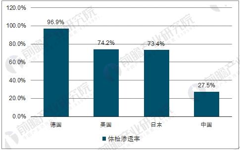 我国体检普及率明显低于发达国家,渗透率仅 27.5%。在工业较发达的江浙沪、珠三角等区域,由于企事业单位的团检客户较多,渗透率较高。而在全国大部分地区,团检覆盖面较低。随着团检覆盖面的增加和个检意识增强,体检渗透率还存在提升空间。