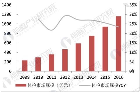 据前瞻产业研究院发布的《健康体检行业发展前景与投资预测分析报告》数据显示,2016年我国体检人次约4亿人次,相较2009年的2.4亿人次增长了66%,年复合增速7.5%。体检行业规模1160亿元,相较2009年的240亿元增长了383%,年复合增速约为20%以上。