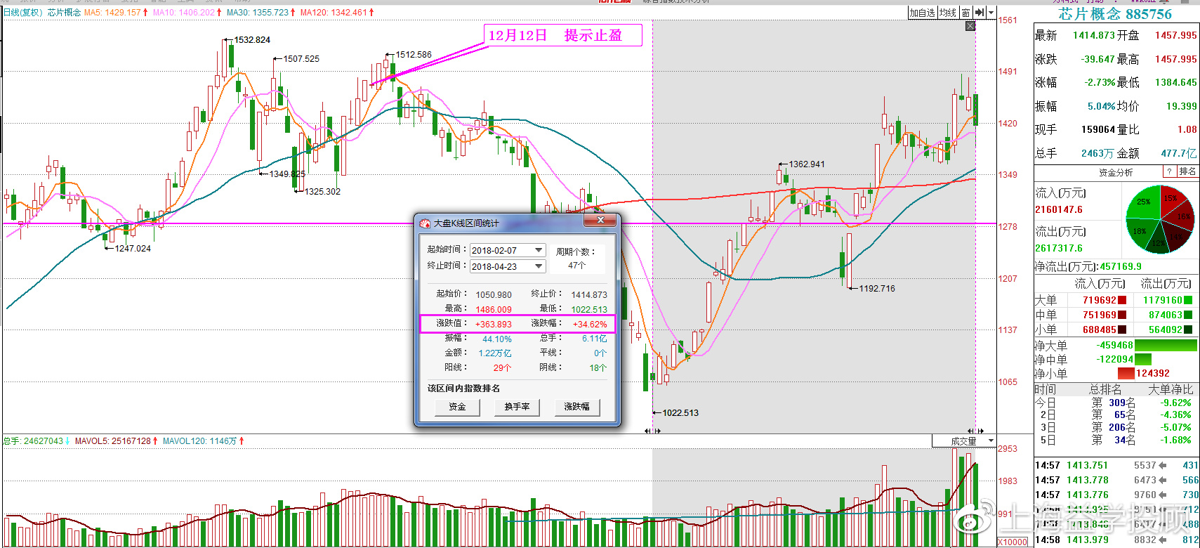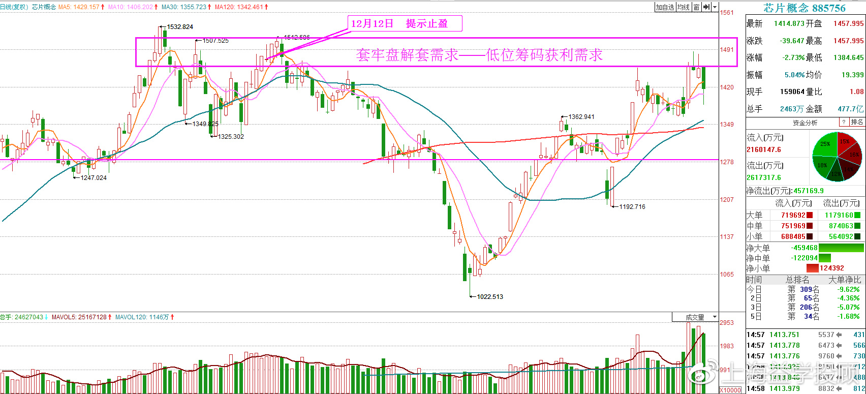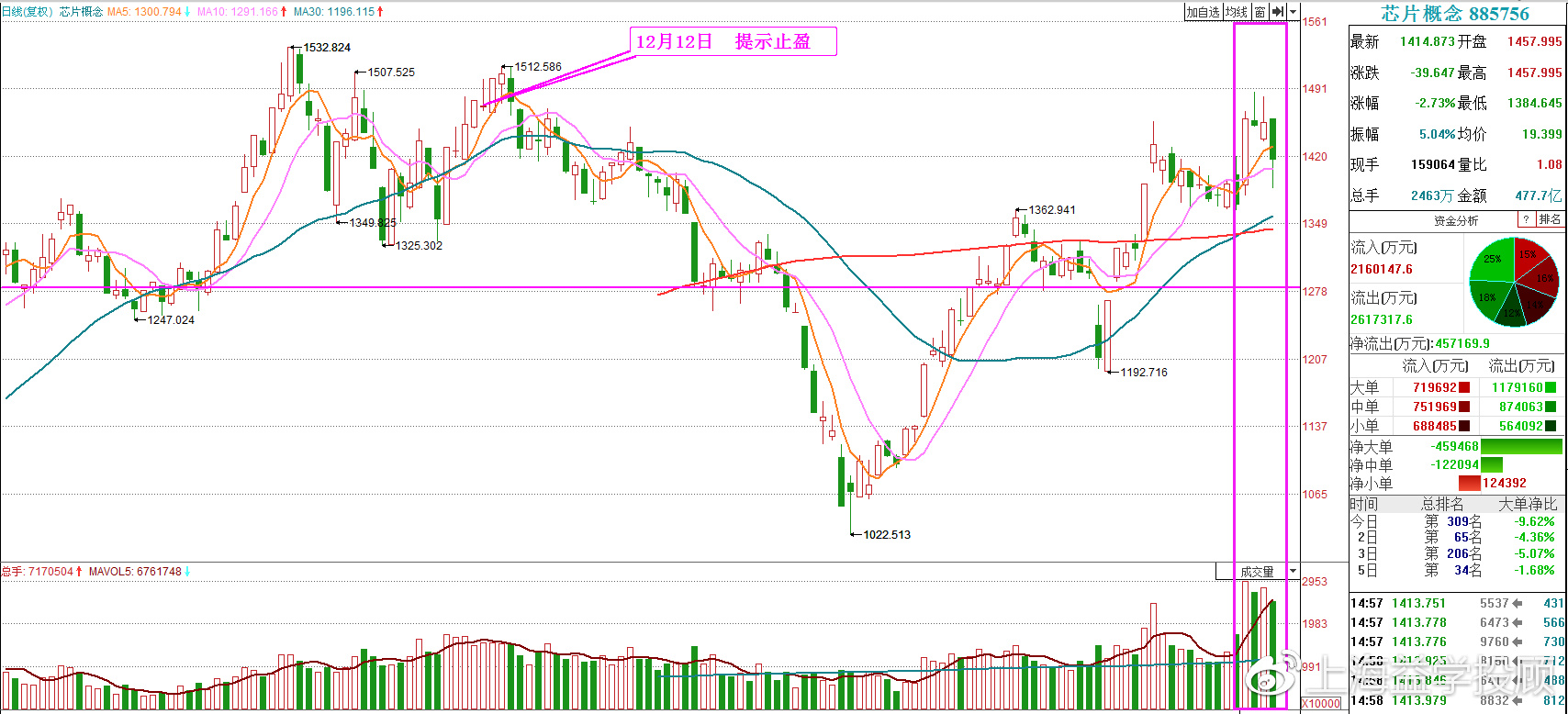 一哥做芯片行情那会,可能还有些朋友没有关注到公众号,记得当时,一哥从芯片概念股整体走势的演化路径做了详细分析。在去年的“双12”就已经发出了止盈信号,随后概念指数大幅回调,跌幅接近30%,基本上就是逃在了最高位。(可以查看公众号历史文章记录)