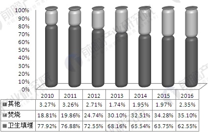 目前,比较提倡的生活垃圾处理是焚烧处理,但我国焚烧处理比例在40%以下,而发达国家普遍在65%以上。填埋处理是我国目前垃圾处理的最主要手段,处理能力占比在60%以上。根据前瞻产业研究院发布的《生活垃圾处理行业发展前景与投资预测分析报告》数据显示,到2016年,我国生活垃圾处理卫生填埋仍是大头,占比达到62.55%。