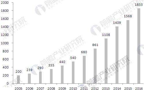 2005-2016年我国智能建筑行业市场规模(单位:亿元)