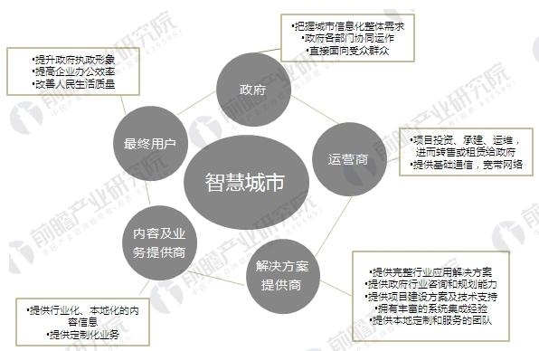 从产业链角度来看,智慧城市的建设涉及的主体包括:政府、运营商、解决方案提供商、内容及业务提供商以及最终用户等。从智慧城市解决方案来看,其产业链上下游涵盖了RFID等芯片制造商;传感器、物联网终端制造商;电信网络设备、IT设备提供商;终端应用软件开放商、系统集成商、智慧城市相关业务运营商以及顶层规划服务提供商等多种科技型企业。