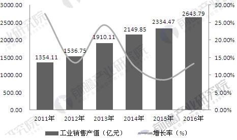 据前瞻产业研究院发布的《医疗器械行业市场需求预测与投资战略规划分析报告》数据显示,2011-2016年,中国医疗器械行业销售产值持续增长,但增长率呈波动变化,总体为下降的趋势,2016年中国医疗器械行业销售产值为2643.79亿元,同比增长13.25%。