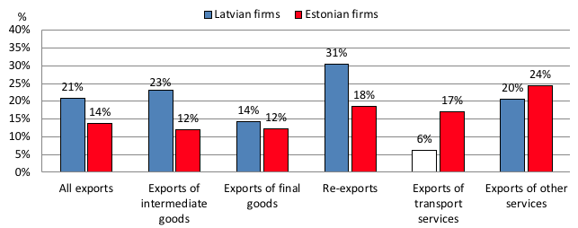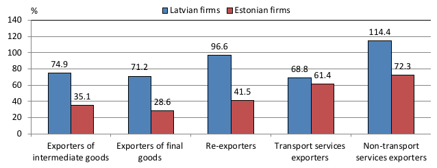 Note: The figure describes the exporters ‘advantage over non-exporters in labour productivity level. For example, Latvian exporters of intermediate goods on average have 75% higher productivity than non-exporters. The premia was estimated by pooled OLS over 2006-2014 (1995-2014 for Estonia). The OLS regressed log labour productivity against a dummy variable indicating export status while controlling for firm age, foreign ownership, location in capital region as well as 2-digit NACE sector and year fixed effects.