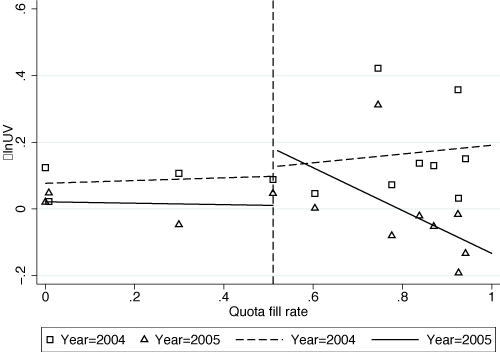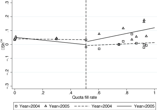 Notes: DShOA denotes the annual change in the share of exports on trade credit (OA terms). DlnUV denotes the annual change in the logarithm of unit values. In the left (right) panel, a marker represents average DShOA (DlnUV) over firms, products and destination countries for a given quota-fill rate and year. Lines represent fitted values of (unconditional) linear predictions. The vertical lines represent the quota fill rate of 0.5 as of 2004.