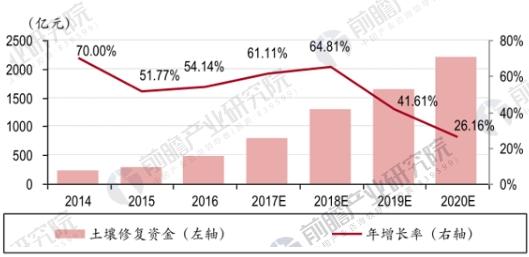 土十条颁布后市场将保持较高速度增长,据前瞻产业研究院发布的《土壤修复行业市场前瞻与投资战略规划分析报告》数据显示,2015年产业规模只有30亿元,2016年增长至90亿元,2017年土壤修复产业规模达到约合240亿元,千亿市场前景可期,预计到2020年市场规模可达到2000亿,年均复合增长率达到49%。