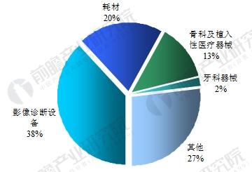 从近三年我国医疗器械市场的产品结构来看,影像诊断设备占据最大的市场份额,近几年均保持在40%左右,且呈不断上升趋势;其次是各类耗材,占据20%左右的市场份额;骨科及植入性医疗器械市场份额不断下降;剩余的市场份额被牙科及其他类器械所占据。