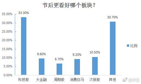 关于节后看好哪个板块的问题,东方财富网调查显示,有33.3%的股民看好科技股;有10.5%的股民对次新股抱有很高的期望;9.6%的股民看好大金融;9.2%的股民看好消费类白马股;股民对于周期股的支持率较低,为6.7%;还有30.7%的股民眼光独到,偏好其他个股。