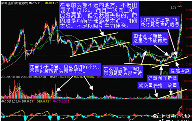 4、最好结合指数情况来研判,如果当时指数也在构筑底部区间,则股价上穿120线成功的概率会大很多,否则需要多研判;