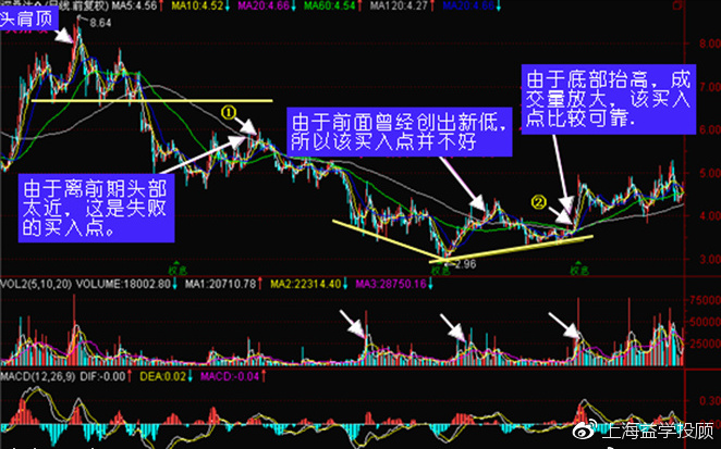 1、股价从前头部下跌的跌幅要有区别,图中上穿120线的①处价格为5.85元,而前期头部头肩顶颈线位的压力是相当大的,颈线位的收盘价为6.58元,那么距离只有:(5.85÷6.58-1)×100=-11.09%。就是说,仅仅只有11%的上行空间,那么你认为主力会为了这区区的空间而建仓吗?答案肯定是否定的。由此可见,股价筑顶后的跌幅越小,其股价上穿120线买入的风险越大。股价涨时必涨过头,跌时必跌过分,因此,买入一个没有跌透的股价,其风险是很大的。