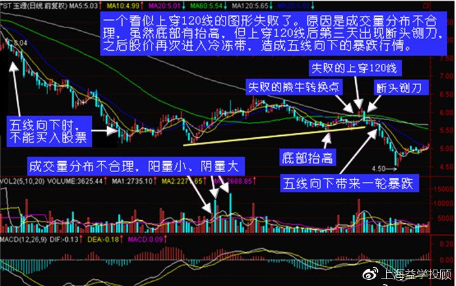 5、一旦股价上穿120线失败之后就要赶快清仓,因为此时往往会形成五线向下的暴跌局面。