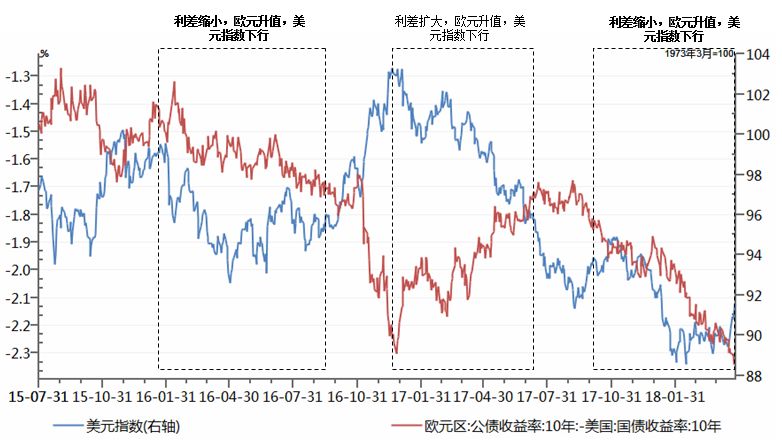 从上图读者依然无法得出欧美利差与美元指数的稳定关系,尽管两者之间似乎具有逻辑上的对应性。