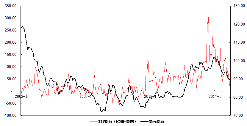 同样,欧元区EPU指数和美国EPU指数的差异也更与美元指数的相关性要强,如下图: