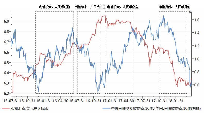 上述说法的潜台词就是中美利差在决定人民币对美元的汇率。事实如此吗?我们来考察一下,任何考察都要设定一个时期,考虑到2015年“811”汇改拉开了人民币汇率双向浮动的改革序幕,我们将下文的考察期间设定为“811”之后,当然按照同样的思路,读者也可以自行设置考察时期。