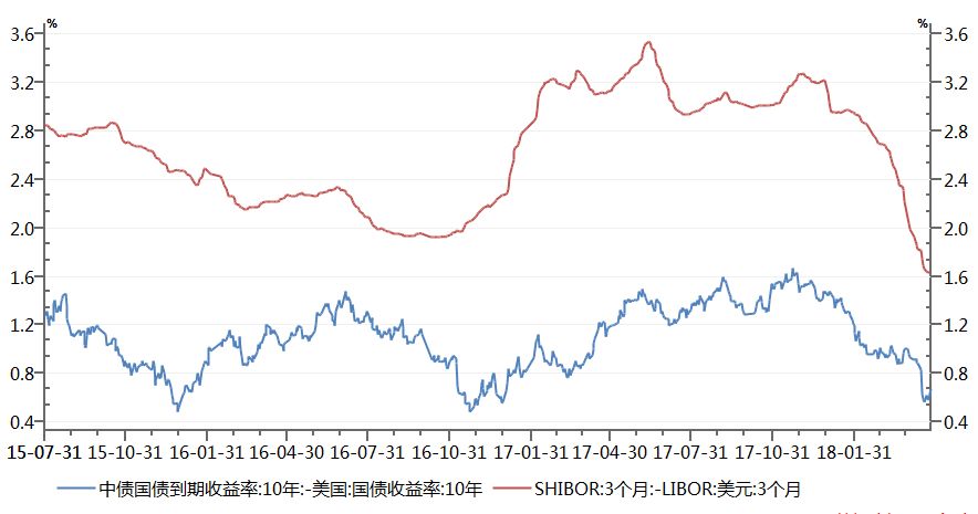 从理论上看,利率平价中的利率是指短期利率,最合适的衡量应该是中国3个月SHIBOR利率减去美国3个月LIBOR利率,但是考虑到大家更习惯用10年中国国债利率减去10年美国国债利率衡量,而且前者和后者的走势虽有差异,但是趋势方向也基本一致,所以不妨根据市场习惯采用中债利率减去美债利率作为利差衡量指标。