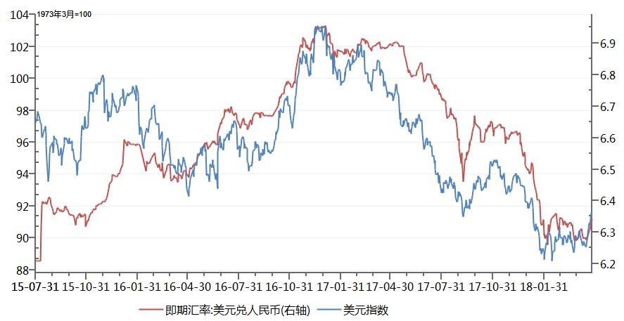 很相关吧?美元指数走强,人民币贬值;美元指数走弱,人民币升值,几乎亦步亦趋。有读者会说,美元汇率和人民币汇率本身就相关,这不是用硬币的正面来解释硬币的反面吗?需要注意的是,这里采用的是美元指数,美元指数是由美元对6种货币对构成,含有欧元(1.2126, -0.0001, -0.01%)、日元、英镑(1.3782, 0.0007, 0.05%)、加拿大元、瑞典克朗和瑞士法郎,其中欧元的权重具有主导地位,并不含有人民币。即美元指数的运行是脱离人民币因素而独立运行的,美元指数与人民币对美元汇率走势相关,并不存在自相关的错误。
