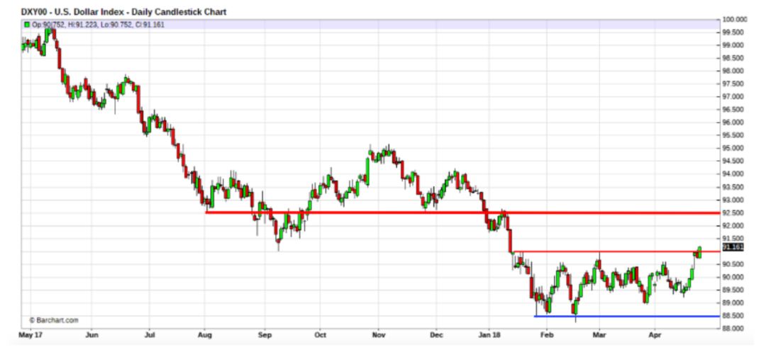 美元指数已跃升至91,这完全不是一个很好的迹象。如果它在本周末没有反转,我们可能会看到它再上升150个基点,到92.50-93.00。