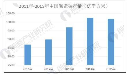 近年来,我国陶瓷砖产量保持稳定增长。据前瞻产业研究院发布的《中国瓷砖行业产销需求与市场前瞻分析报告》数据统计,2011年至2015 年,我国陶瓷砖产量由 87.00 亿平方米增长至101.80 亿平方米。