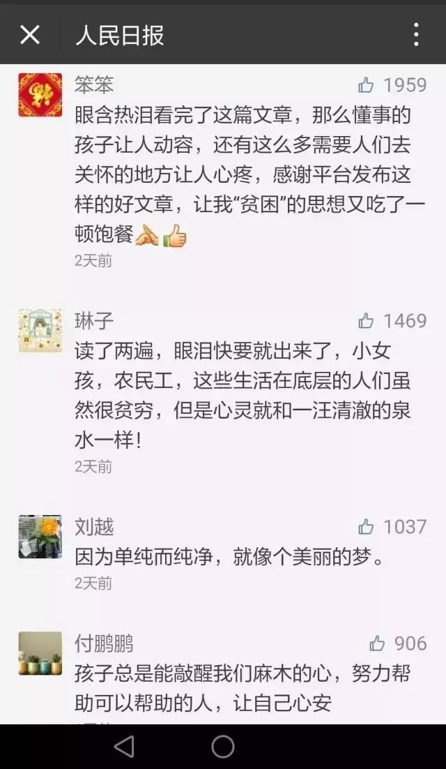 目前,这篇文章在人民日报微信中获得一万多个点ZAN,大家都被孩子的善良和纯真感动了: