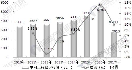 但总体上,我国电力建设尤其是电网建设依然落后于我国经济发展的需求,我国需要在电网工程方面进行投资来完成我国电网的整体布局。2016年我国电网投资5426亿元,同比增长16.94%;2017年1-7月,全国电网工程完成投资2813亿元,同比增长9.90%。