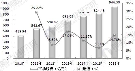 2010-2016年中国电能质量治理产业发展规模(单位:亿元,%)