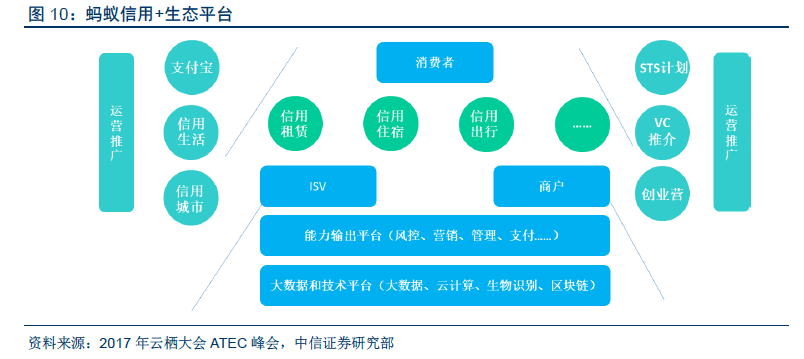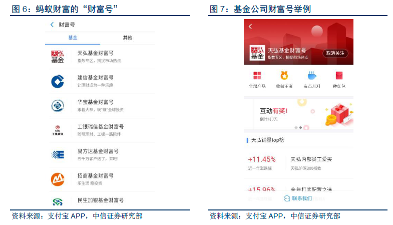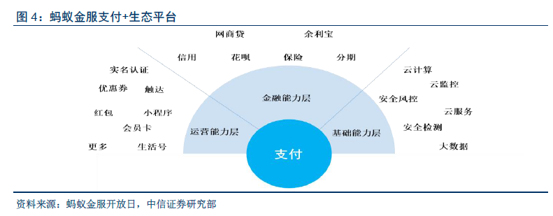 理财平台主要以蚂蚁财富为载体,是面向金融机构的开放平台。蚂蚁财富目前涵盖余额宝、定期、基金、黄金和股票行情5 大板块。平台合作超过100 家基金公司的2600+只基金。2017 年6 月上线“财富号”,向金融机构开放自运营平台,提供用户触达、数据、营销等一系列技术能力支持,提供AI 技术以更好建立用户洞察,帮助金融机构进行用户画像和打造属于自己的品牌专区,根据2017 年阿里投资者开放日蚂蚁金服披露的数据,合作金融机构客户转化率提升了69%。